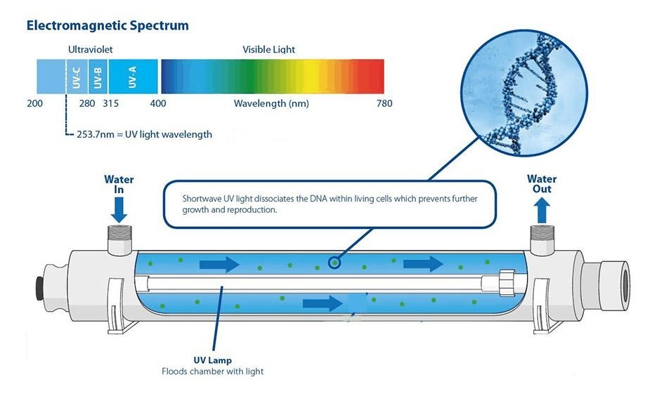 UVC system removes all water particals -bacteria - chemicals - heavy metals, will not touch minerals,  no waist water.