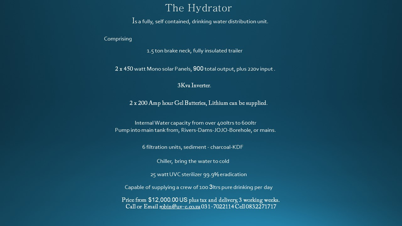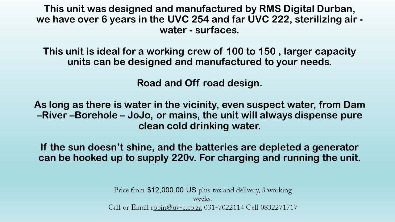 Spending so much money in purchasing water is a thing of the past, now you can produce your own straight from the tap, the same as the large company’s produce. Our system of filtration and sterilizing uses UVC light not reverse osmoses’ which until now was the most popular way, but wasted 2ltrs for every 1 litre produced. Domestic systems use the excact system that produces of bottled water use, and these are sediment filter first, then Carbon filter, and last KDF which removes harmful chemicals, final step uses UVC to sterilize the water to a degree of 99.980% free of bacteria, all of these make sure the water is pure and sterile without losing the minerals that are important in healthy water.